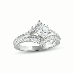 Elegant and enchanting, this engagement ring for her showcases a 1/2-carat round center diamond that sparkles between chevrons of cool 14K white gold. Shimmering round diamonds add allure to the edges and sweep down to adorn the band. The ring has a total diamond weight of 1 carat.