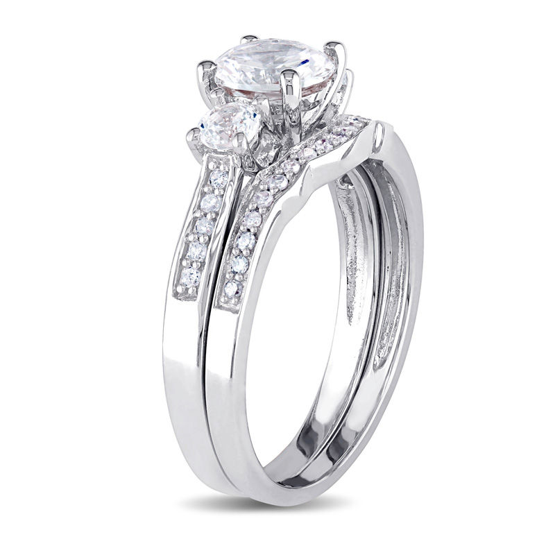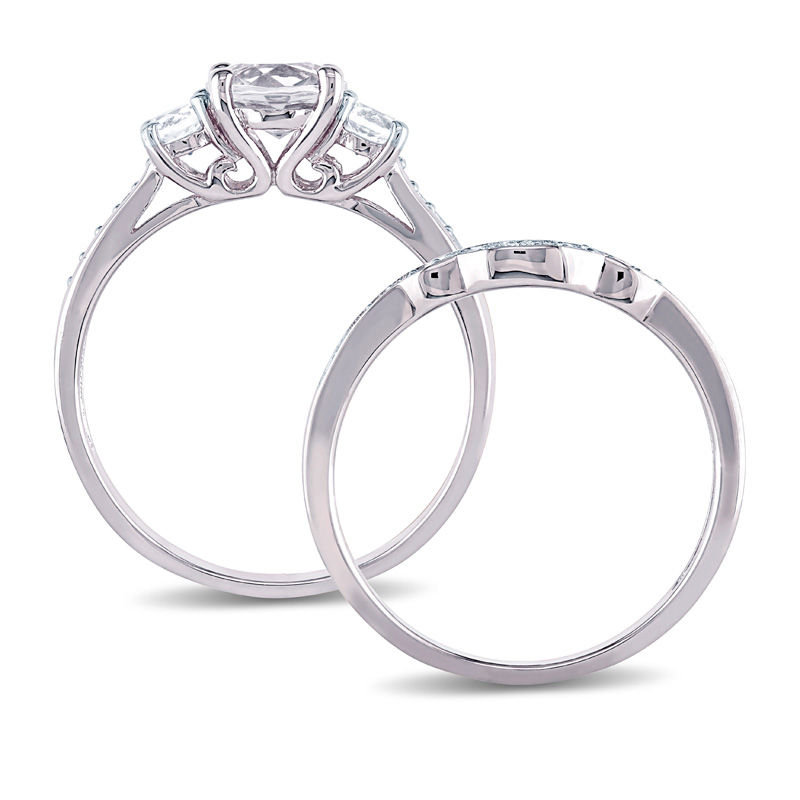 6.0mm White Sapphire and 1/8 CT. T.W. Diamond Three Stone Bridal Set in 10K White Gold