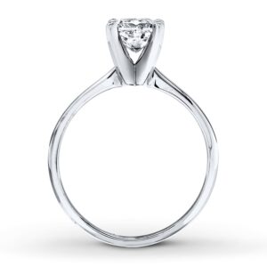 A dazzling 1 carat princess-cut diamond sparkles at the center of this impressive solitaire engagement ring for her. The band is styled in 14K white gold.